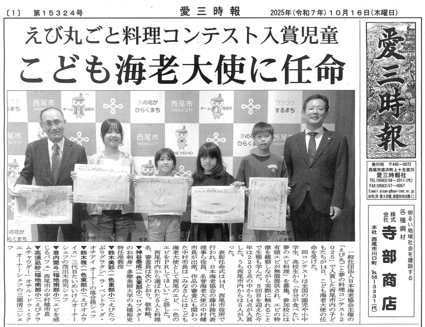 2025年10月14日、「えび丸ごと夢の料理コンテスト2025」(主催:一般社団法人日本海老協会)の特別表彰任命式が、西尾市役所で開催されました。